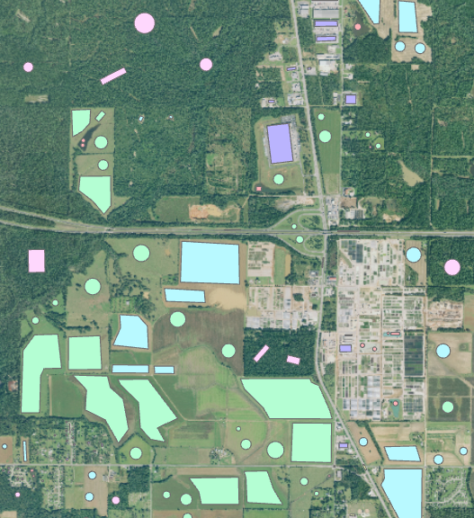 We have labelled a few training polygons in the northern regions of Alabama state. The training data has the polygons labelled for six land cover classes namely 'buildings', 'roads and parking lots', 'water', 'harvested, open and bare lands', 'forest' and 'planted crops'. We need to classify NAIP imagery against these land cover classes.