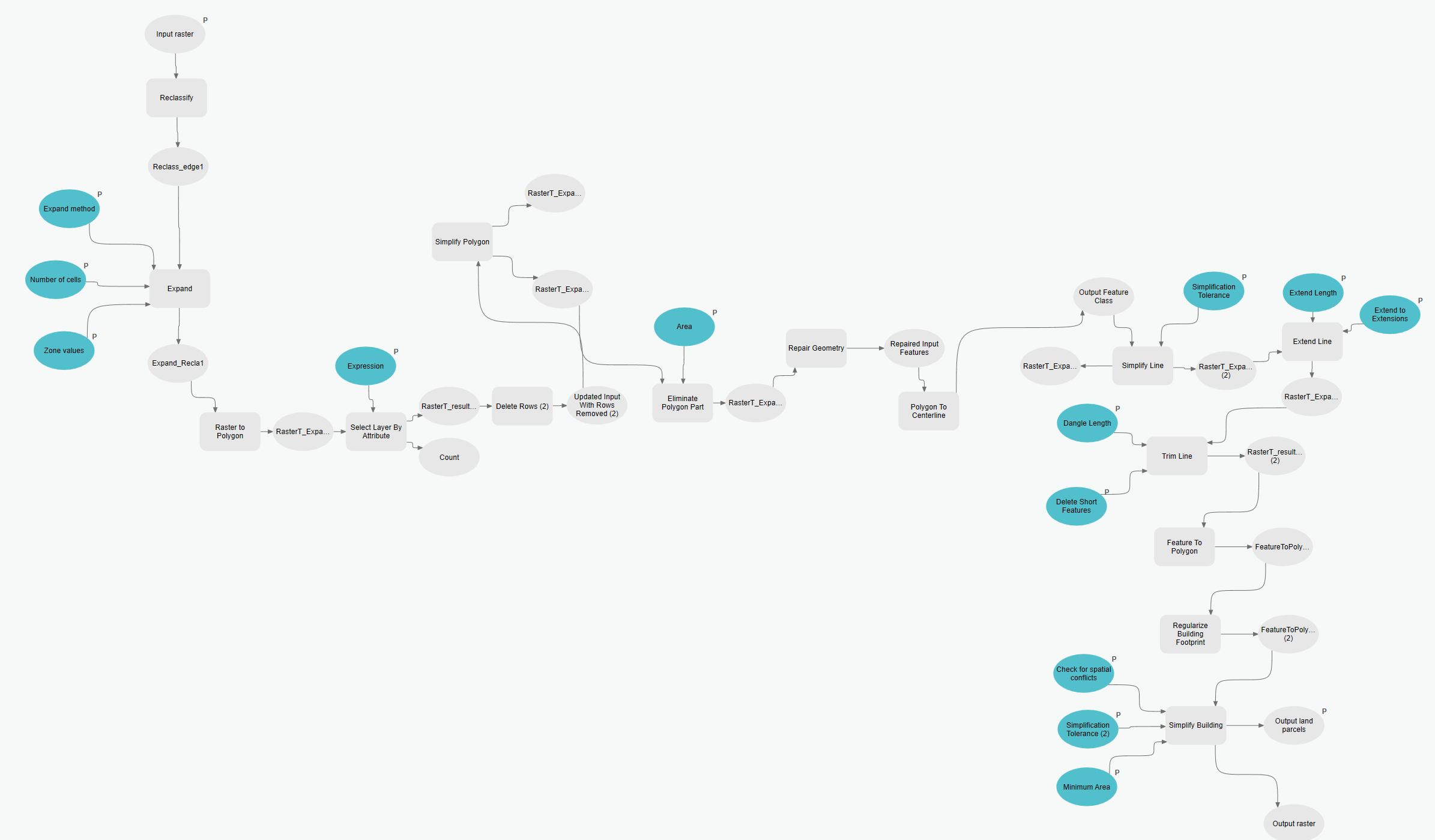 Input raster: Predicted reclassified raster with 0-255 range pixel value. where 0:background and 255:edge.Expand: Expands specified zones of a raster by a specified number of cells. default value set for number of cells to 3.Raster to polygon: Vectorizes raster to polygon based on cell values, we will keep the 'Simplify Polygons' and 'Create Multipart Features' options unchecked.Select by attribute: Adds, updates, or removes a selection based on an attribute query. We try to filter out polygons with smaller area.Simplify polygon: Simplifies polygon outlines by removing relatively extraneous vertices while preserving essential shape. Simplification tolerance was set to 0.1.Eliminate polygon parts: Creates a new output feature class containing the features from the input polygons with some parts or holes of a specified size deleted. 'Condition' was set to 'area'.Polygon to centerline: Creates centerlines from polygon features.Simplify line: Simplifies lines by removing relatively extraneous vertices while preserving essential shape. Simplification tolerance was set to 4.Trim line: Removes portions of a line that extend a specified distance past a line intersection (dangles). Dangle length was set to 100 and delete short features.Feature to polygon: Creates a feature class containing polygons generated from areas enclosed by input line or polygon features.Regularize building footprints: This tool will produce the final finished results by shaping them to how actual buildings look. 'Method' for regularisation would be 'Right Angles and Diagonal' and the parameters 'tolerance', 'Densification' and 'Precision' are '1.5', '1', '0.25' and '2' respectively.Simplify building: Simplifies the boundary or footprint of building polygons while maintaining their essential shape and size.