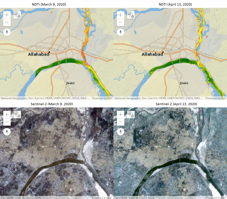 The maps above show the spatio-temporal variation in turbidity of the Ganga and Yamuna rivers due to Covid-19 lockdown. The satellite imageries used in the analysis are from before lockdown, dated March 9, 2020 (bottom-left), and during the lockdown, dated April 13, 2020 (botton-right).