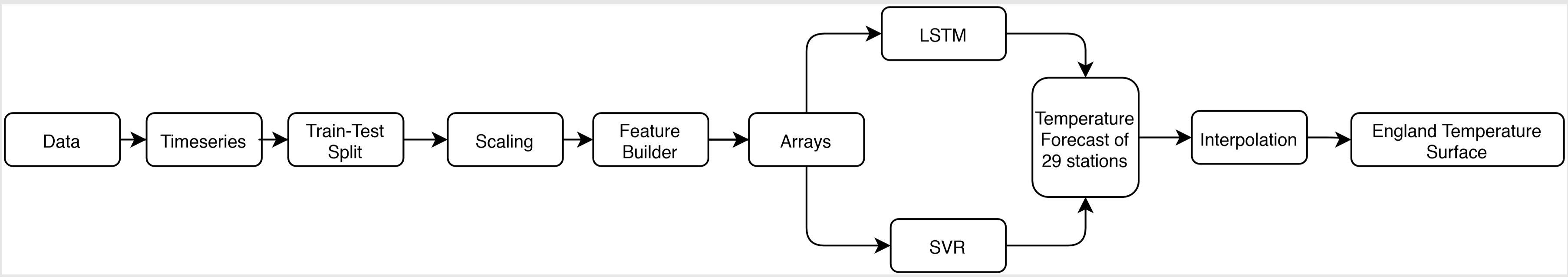 Historic temperature data from various weather stations across England is collected from here. The data consists of daily temperature measurements ranging from February 2005 till September 2019 which are auto regressed to predict daily temperature for each of the identified stations for October 2019. The forecasted temperature obtained for the stations is then spatially interpolated using ArcGIS spatial interpolation tool to produce a temperature prediction surface for the entire country. Here is a schematic flow chart of the operation: