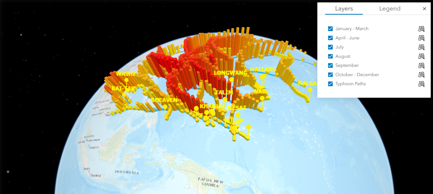 Let's say, we are only interested in the storms that occur in summer. Summer in tropical Asia is around April-June and that matches with a layer in the existing web scene. We will use the layers