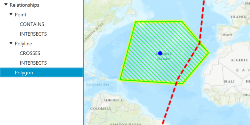 For each spatial relationship, there is a method that returns a Boolean value indicating whether that relationship is true of the two geometries. For spatial relationships that are true of one geometry but not the other, such as Within or Contains, the geometry engine considers the order of the geometries entered.