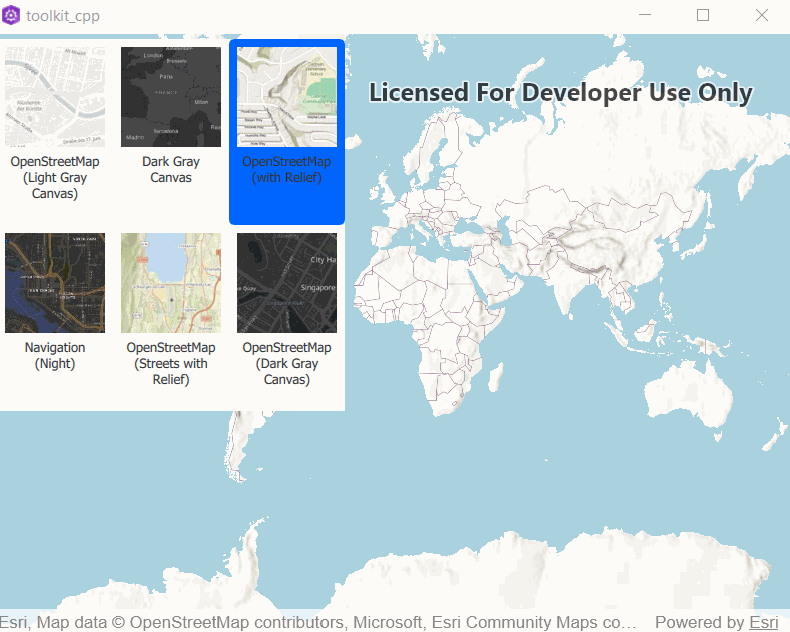 The BasemapGallery displays a collection of items representing basemaps from either ArcGIS Online, a user-defined portal, or an array of Basemaps. When the user selects a basemap from the BasemapGallery, the basemap rendered in the current geoModel is removed from the given map/scene and replaced with the basemap selected in the gallery.